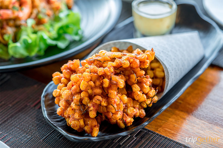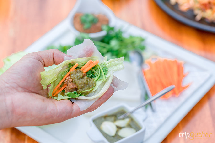 มาถึงเมนูทานเล่นอย่าง ทอดมันข้าวโพด ที่เสิร์ฟพร้อมซอสหวาน และ ก๋วยเตี๋ยวหมูห่อ เดอะ ปาซ เมนูทานเล่นแบบ DIY ทานพร้อมผักสด สดชื่นทุกคำ