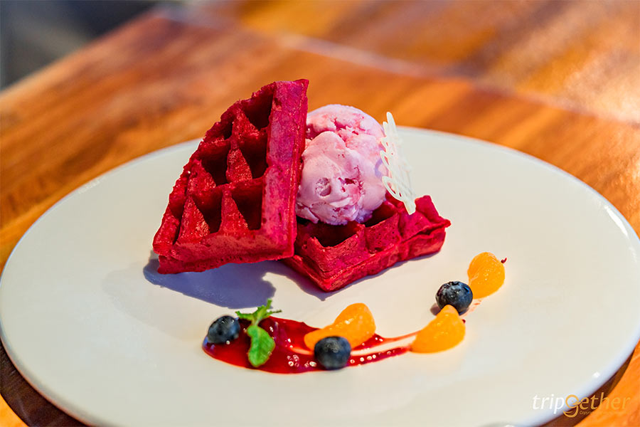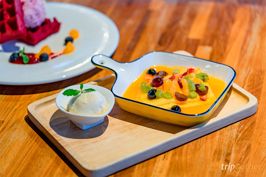 ปิดท้ายด้วยของหวานและเครื่องดื่มอย่าง เครปซอสส้ม ที่เสิร์ฟพร้อมผลไม้และไอศกรีมวานิลลา Red Velvet Waffle วาฟเฟิลร้อนๆ กรอบนอกนุ่มใน เสิร์ฟคู่มากับไอศกรีมและซอสสตรอว์เบอร์รี่