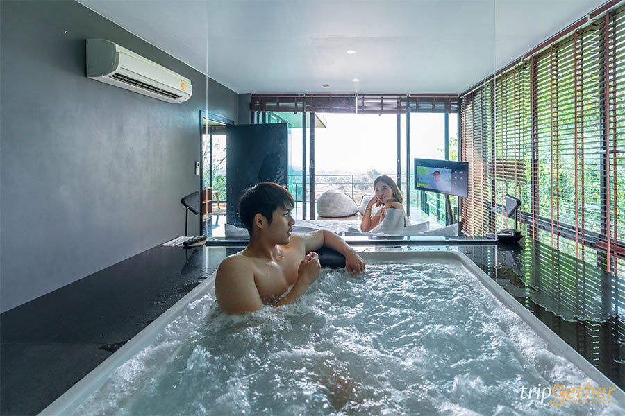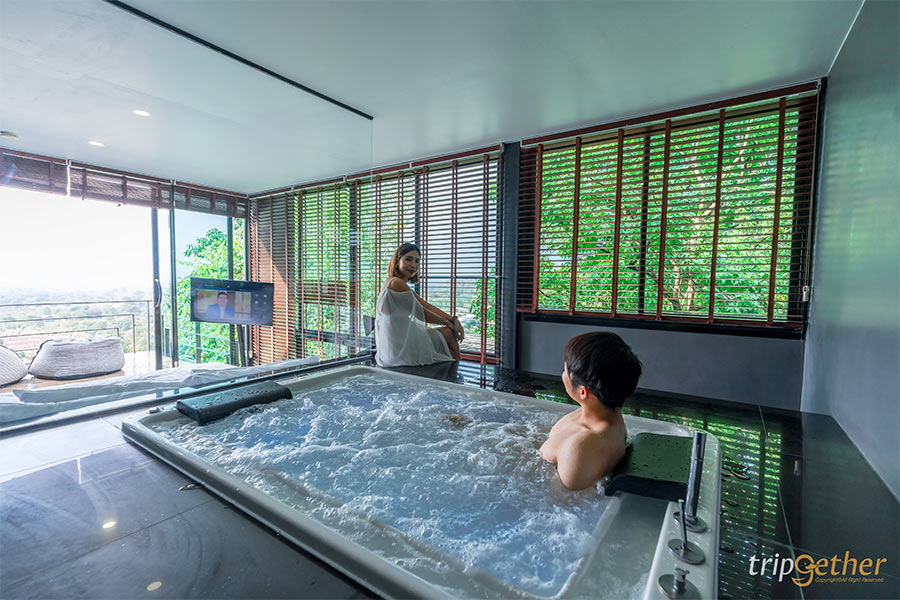 อีกหนึ่งห้องที่อยากแนะนำเลยก็คือ Jacuzzi Villa เรียกได้ว่าเป็นอีกระดับของการพักผ่อนเลยก็ว่าได้กับการลงแช่อ่าง Jacuzzi ที่อยู่ภายในห้องนอน สามารถแช่ไปชมวิวไปได้อย่างผ่อนคลายและมีความเป็นส่วนตัว นอกจากนี้ยังมีห้องนั่งเล่น และ Pantry area สามารถสั่ง Room Service มาทานดินเนอร์ใต้แสงเทียนในห้องได้อีกด้วย ที่ขาดไม่ได้คือ ระเบียงขนาดใหญ่ที่ชมวิวได้แบบพาโนราม่า แถมตอนเช้าห้องนี้ยังมีบริการ Breakfast In Bed ให้อีกด้วยนะ
