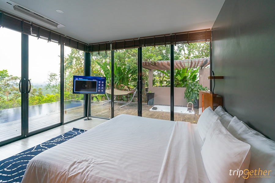 ในส่วนของห้องนอนบอกเลยว่ากว้างขวางสุดๆ ไฮไลท์คือเตียง King size ที่วางหันหน้าออกสามารถนอนมองวิวสวยๆ ได้จากที่นอน และผนังห้องที่เป็นกระจกใสบานใหญ่ยังสามารถเปิดออกไปที่อ่างจากุซซี่และสระว่ายน้ำได้อีกด้วย