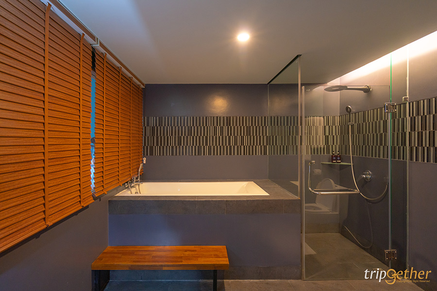 ในส่วนของห้องน้ำจะแบ่งเป็นอ่างอาบน้ำ แยกโซนเปียกสำหรับตู้อาบน้ำ และโซนแห้งอย่างชัดเจน