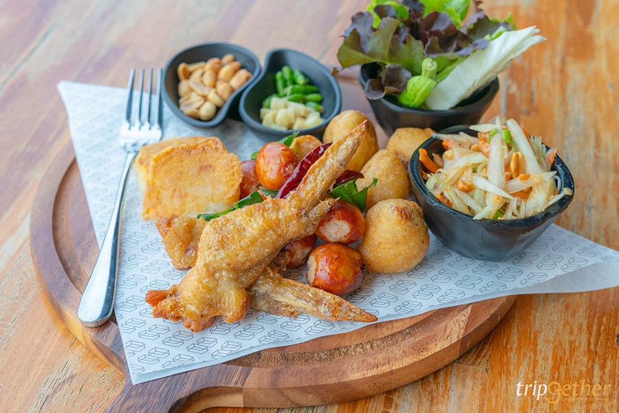 ปิดท้ายเมนูของคาวด้วย เดอะ ปาซ แพลตเตอร์ เมนูสไตล์อีสานที่เสิร์ฟด้วยปีกไก่ทอด แหนมเห็ด ไส้กรอกอีสาน ข้าวจี่ และส้มตำ