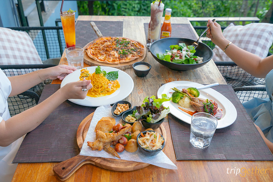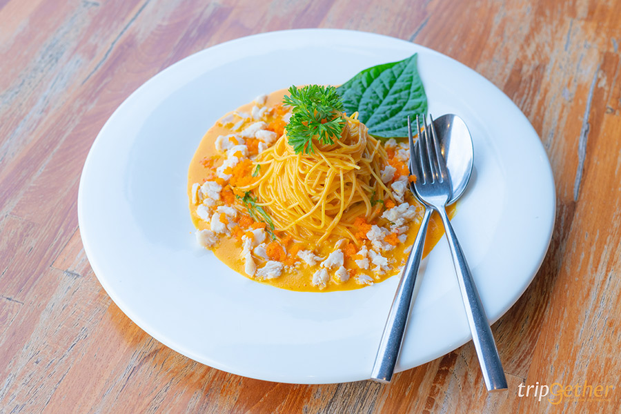 เมนูวันนี้ของเรา เริ่มกันที่ พิซซ่าไส้อั่วและกะเพราหมู พิซซ่าเตาถ่านที่เสิร์ฟมาสองหน้าในหนึ่งถาด ผสมผสานกันระหว่างความเป็นอิตาเลียนและความเป็นไทย มาต่อกันที่ สลัดซีซาร์ ผักสลัดสดๆ เสิร์ฟคู่กับน้ำสลัดสูตรพิเศษของทางร้าน ตามด้วยเมนูซิกเนเจอร์อย่าง Duck Confit Kaprao สะโพกเป็ดตุ๋นสไตล์ฝรั่งเศสทอดน้ำมันเสิร์ฟกับซอสกะเพราแดง ยังไม่หมดเท่านี้เพราะยังมี เดอะปาซ สปาเก็ตตี้ซอสแกงปู เมนูที่ใครมาแล้วต้องห้ามพลาด ความลงตัวกันของเส้นสปาเก็ตตี้กับซอสแกงปูสุดเข้มข้นถึงเครื่องได้ชิมแล้วต้องติดใจแน่นอน