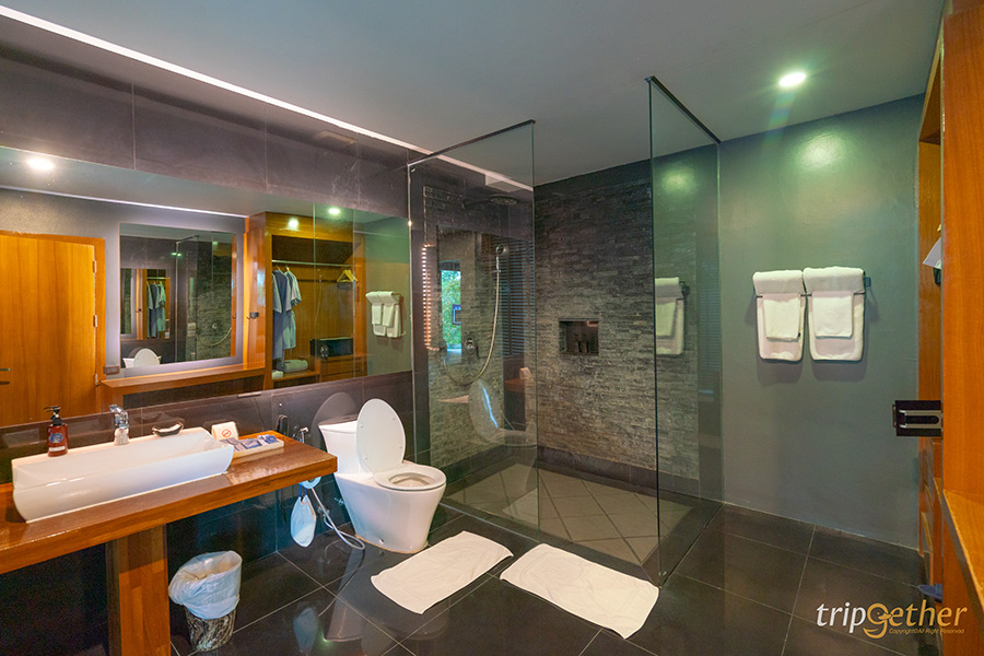 ภายในห้องน้ำมีการแบ่งแยกโซนเปียกและโซนแห้งไว้อย่างชัดเจน มีตู้เสื้อผ้าและกระจกบานใหญ่ พร้อมกับสิ่งอำนวยความสะดวกต่างๆ รวมไปถึงพื้นที่ของห้องน้ำยังกว้างขวางอีกด้วย