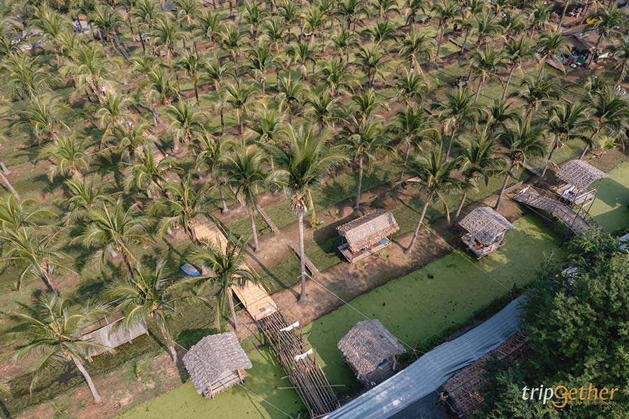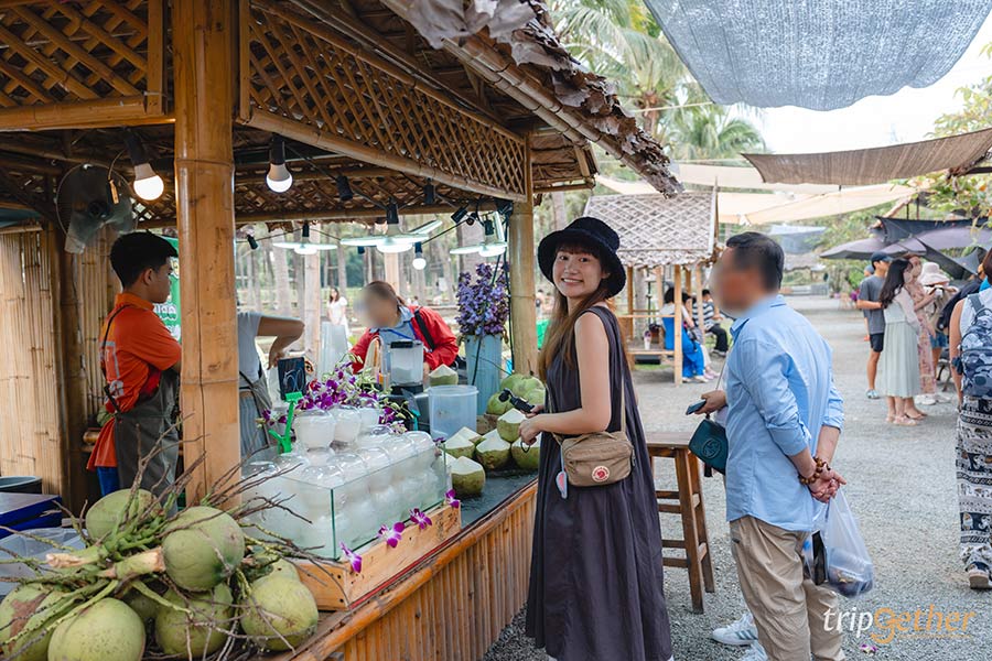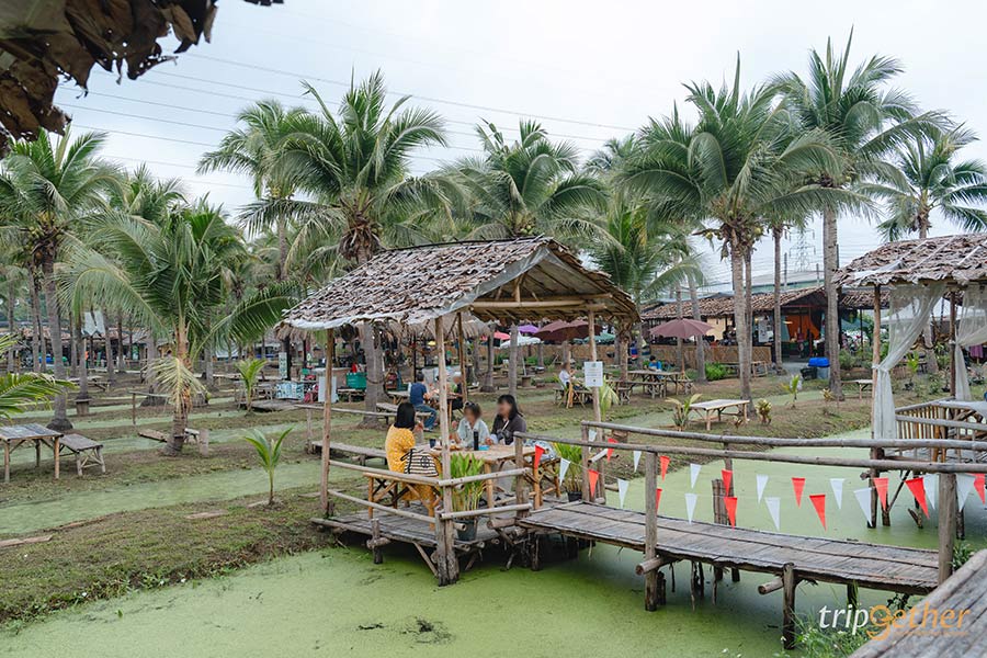 บนพื้นที่กว่า 10 ไร่ ทางตลาดได้แบ่งสัดส่วนไว้อย่างลงตัว โดยจะแบ่งเป็นโซนต้นมะพร้าว ซึ่งเป็นบริเวณที่ใหญ่ที่สุดมีต้นมะพร้าวสูงตั้งเรียงรายสลับกับคูน้ำ สามารถมาเดินรับลมชิลล์ๆ หรือมานั่งกินข้าวก็ได้ โดยทางตลาดได้จัดเตรียมโต๊ะเก้าอี้และซุ้มไม้ให้โดยเฉพาะ บอกเลยว่าความร่มรื่นเอาไปเต็ม 10 ฟีลดีเหมาะกับการมาช่วงเช้าที่อากาศเย็นสบายสุดๆ และแนะนำเล็กน้อยว่าใครที่เดินตามร่องสวนนี้ให้ระวังลื่นกันด้วย!