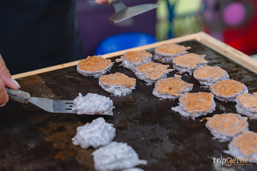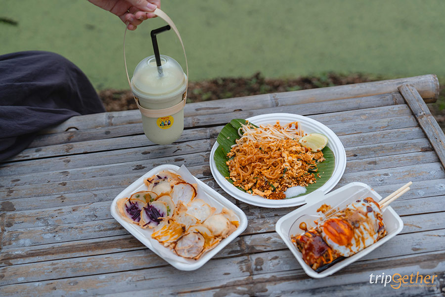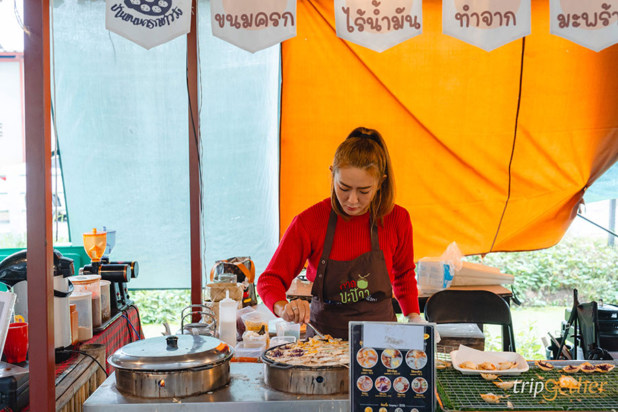 หลังจากเดินเล่นในสวนเสร็จแล้วก็ถึงเวลามาเดินหาของอร่อยกัน ในส่วนของตลาดจะแบ่งให้ช้อป 2 โซนหลักๆ คือ โซนของกินและโซนสินค้า มาเริ่มที่โซนของกินกันก่อน ซึ่งโซนนี้จะเริ่มตั้งแต่ด้านหน้าทางเข้า เดินมาจะเจอกับร้านค้าตั้งเรียงรายเต็มสองข้างทาง ของกินมีให้เลือกหลากหลาย มีครบทั้งของคาว ของหวาน และเครื่องดื่ม บอกเลยว่าเยอะละลานตาอยากจะแวะไปซื้อทุกร้าน