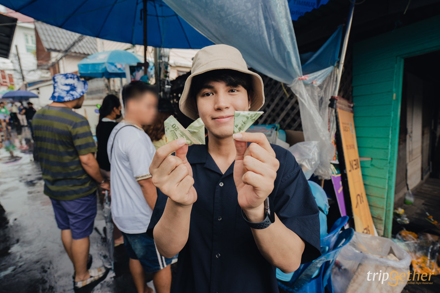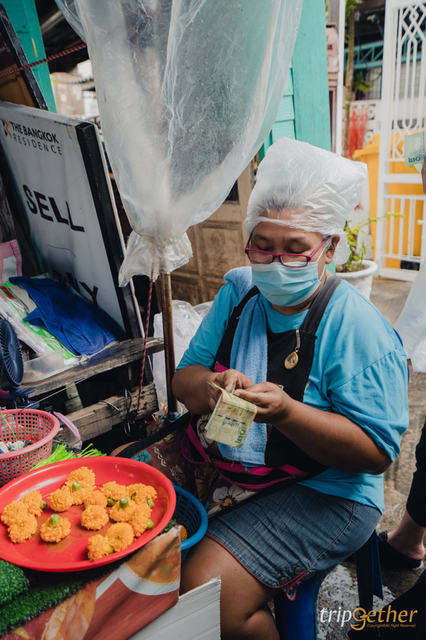 ขอพรเสร็จแล้ว ถ้าใครสนใจอยากดูดวงเพิ่มเติม ก็สามารถไปที่ร้านขายพวงมาลัยร้านสุดท้ายได้เลย เพราะคุณป้าจะดูดวงจากเลขธนบัตรที่เราเลือกประทับยันตร์ไว้ได้ และถ้าเป็นมงคลคุณป้าก็จะพับไว้ให้เราพกติดตัวเพื่อเสริมดวงอีกด้วย