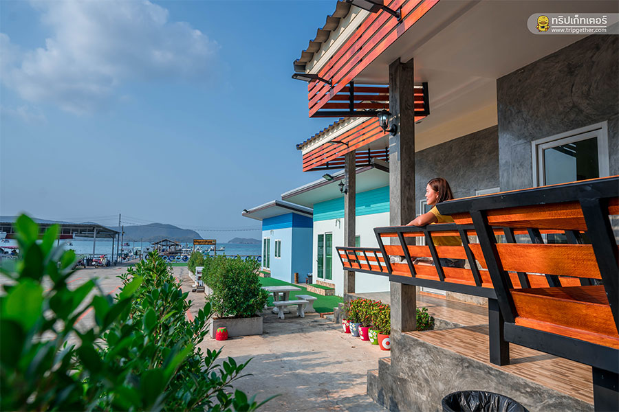 บรรยากาศรอบๆ ที่พักสะอาด แถมยังมีระเบียงส่วนตัวหน้าห้องพักให้มองดูทะเลกันแบบชิลล์ๆ หรือถ้าใครอยากซื้ออาหารทะเลมาปิ้งย่าง ทางที่พักก็มีอุปกรณ์ให้ยืมแบบฟรีๆ