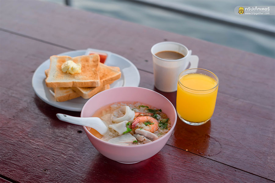 อาหารเช้าของโฮมสเตย์จัดเต็มไปกับข้าวต้มกุ้งตัวโต ขนมปังปิ้ง กาแฟ และน้ำผลไม้