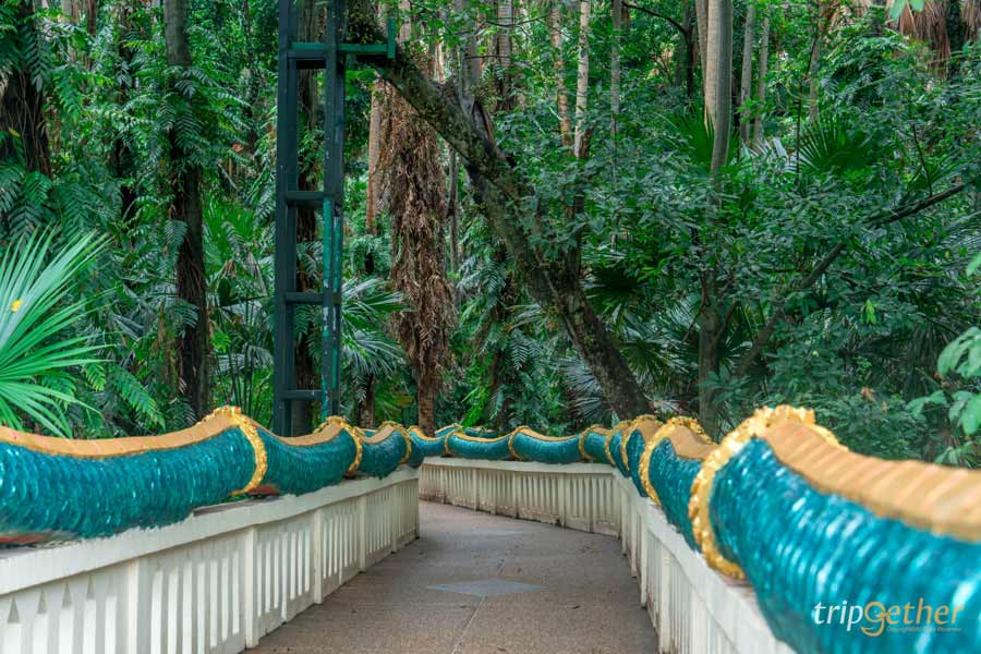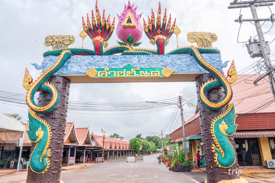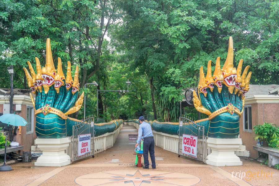 สะพานปูนปั้นรูปพญานาคเจ็ดเศียรคู่กันทอดยาวนำทางเราเข้าสู่ป่าคำชะโนด ดินแดนพญานาค โดยช่วงบริเวณตรงกลางสะพานจะมีแผ่นเหล็กเป็นรอยต่อที่เชื่อมกันไม่ติด โดยชาวบ้านเชื่อว่าจุดนนี้ถือเป็นจุดแบ่งเขตแดนระหว่างเมืองพญานาคกับเมืองมนุษย์ จึงไม่สามารถเชื่อมติดได้