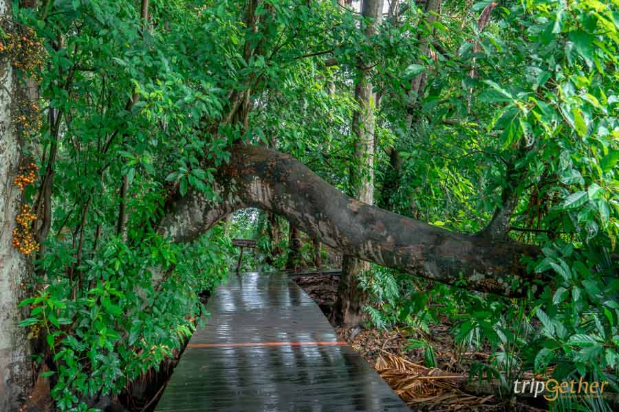 ทั้งสองข้างของสะพานปกคลุมด้วยต้นไม้สูงใหญ่ให้ร่มเงาร่มรื่น