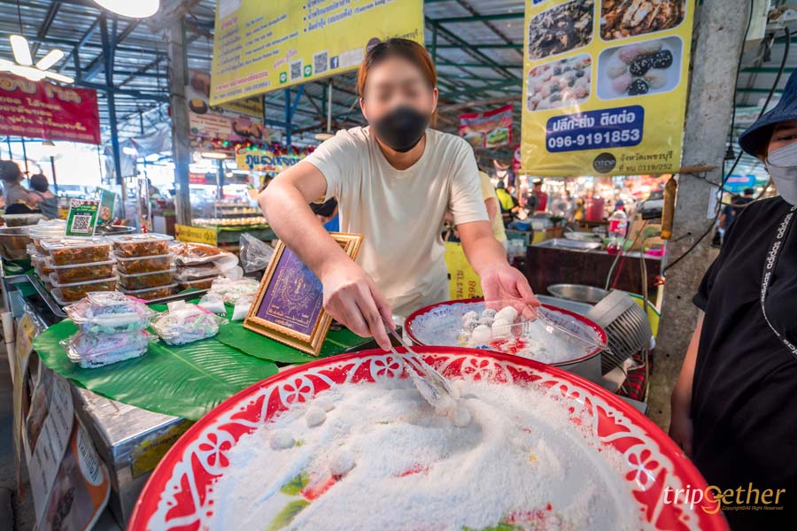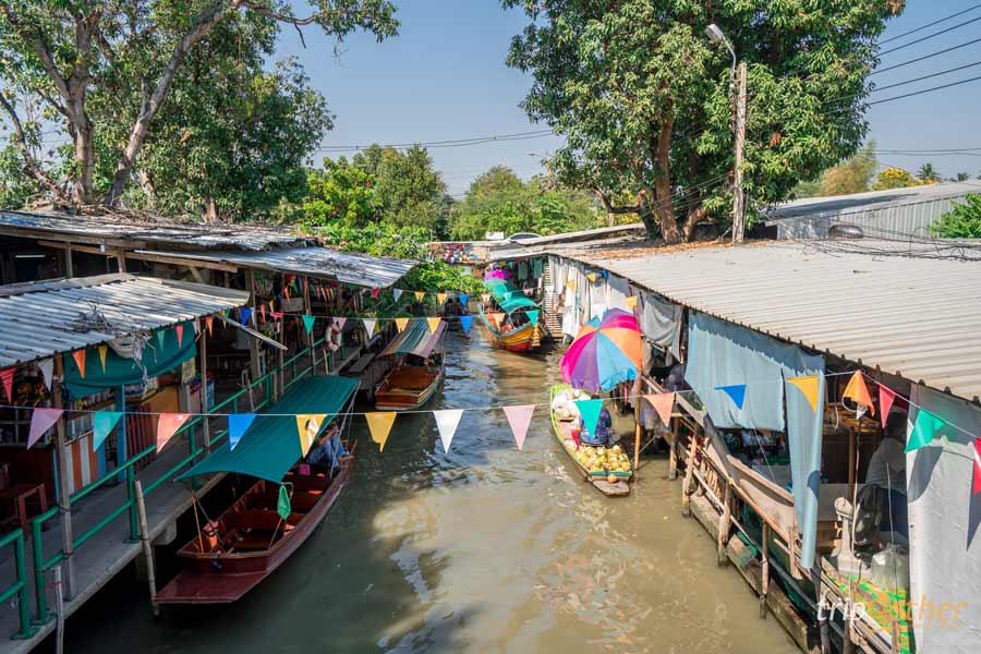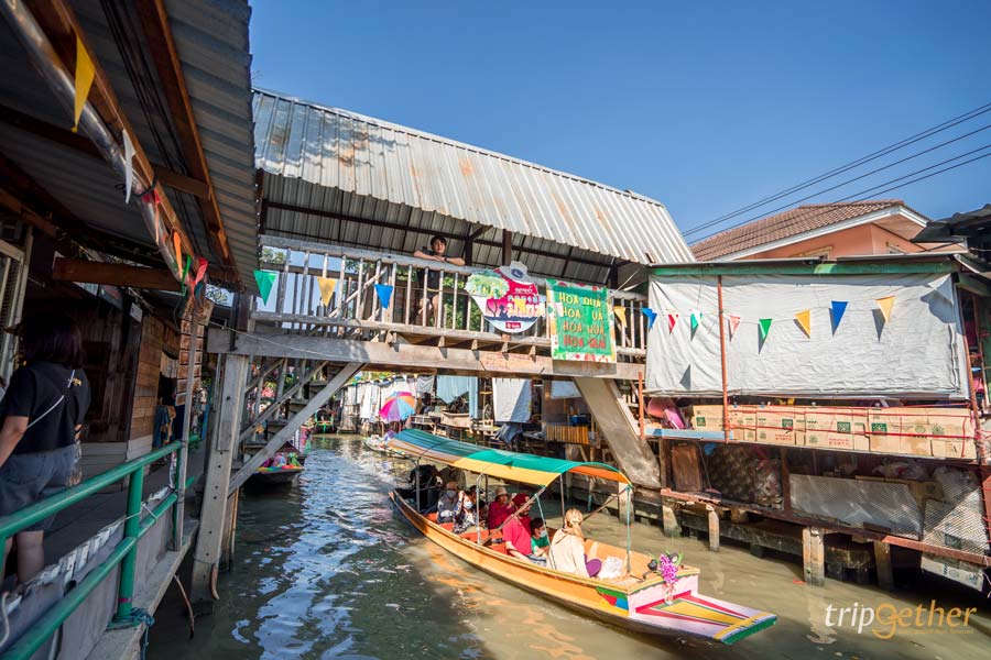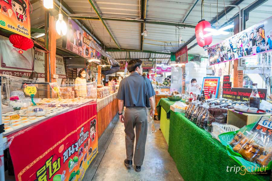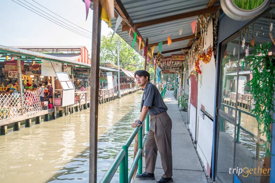 บริเวณของตลาดล้อมรอบด้วยแม่น้ำ ให้ความรู้สึกย้อนยุคเบาๆ ที่มีพ่อค้าแม่ค้าพายเรือขายของขายผักผลไม้จากสวน