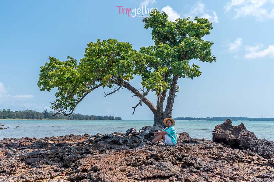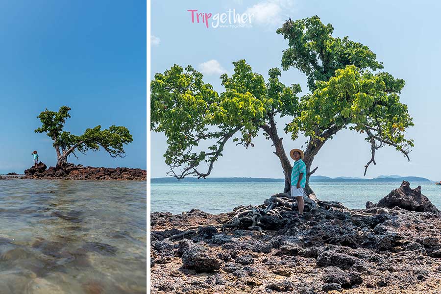 ปลายแสงจะพบกับเกาะขายหัวเราะ ซึ่งเป็นเนินหินเล็กๆ ที่มีต้นไม้ใหญ่ยืนหยัดความแข็งแกร่ง แต่เราเดินทางมาในช่วงบ่ายน้ำยังลด ถ้าหากอยากได้ภาพสวยแบบน้ำรอบเกาะ แนะนำให้มาช่วงเช้าหรือช่วงเย็นที่จะมีวิวพระอาทิตย์ตกบริเวณด้านหลัง