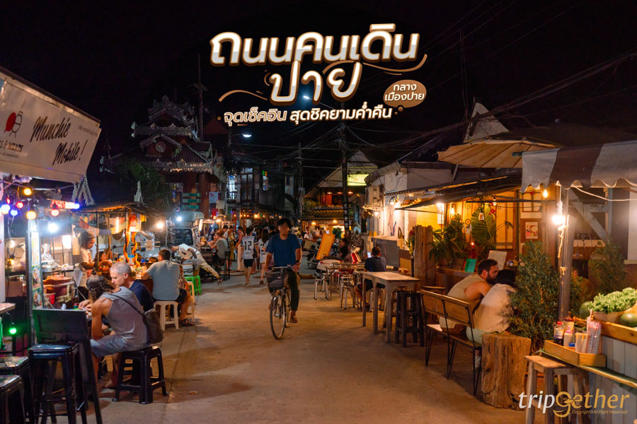 ถนนคนเดินปาย ที่เที่ยวสุดชิคในยามค่ำคืนที่มีนักท่องเที่ยวทั้งชาวไทยและชาวต่างชาติจำนวนมากนิยมมาใช้เวลาเดินเล่นแบบสบายๆ โดยถนนคนเดินปายจะตั้งอยู่ใจกลางเมืองปาย สองฝั่งข้างทางตลอดทั้งถนนจะมีร้านค้าทั้งอาหาร ขนม ของฝาก และเสื้อผ้าที่หลากหลายให้ได้เลือกซื้อ โดยถนนคนเดินปายจะเริ่มตั้งร้านกันราวๆ 5 โมงเย็น และจะคึกตชคักเป็นพิเศษในช่วง 2 ทุ่มเป็นต้นไป ซึ่งสามารถเดินได้ยาวๆ จนถึงราวเที่ยงคืนกันเลย