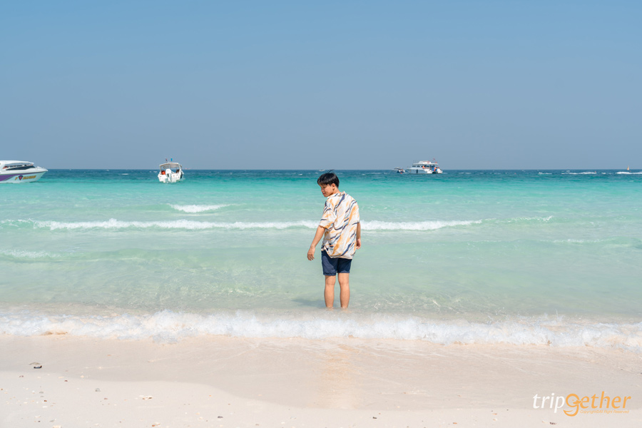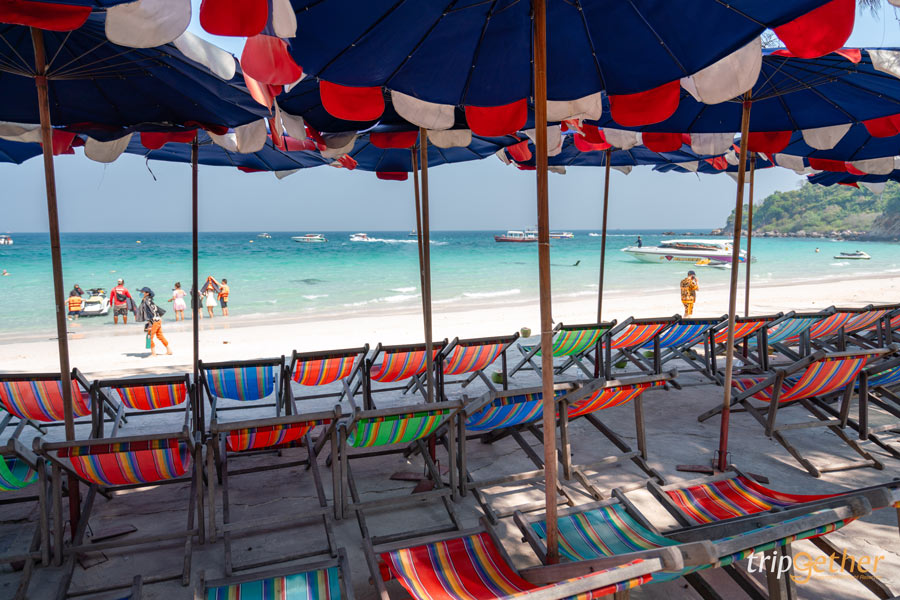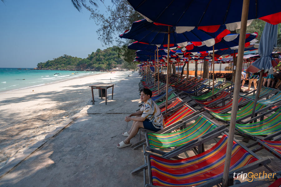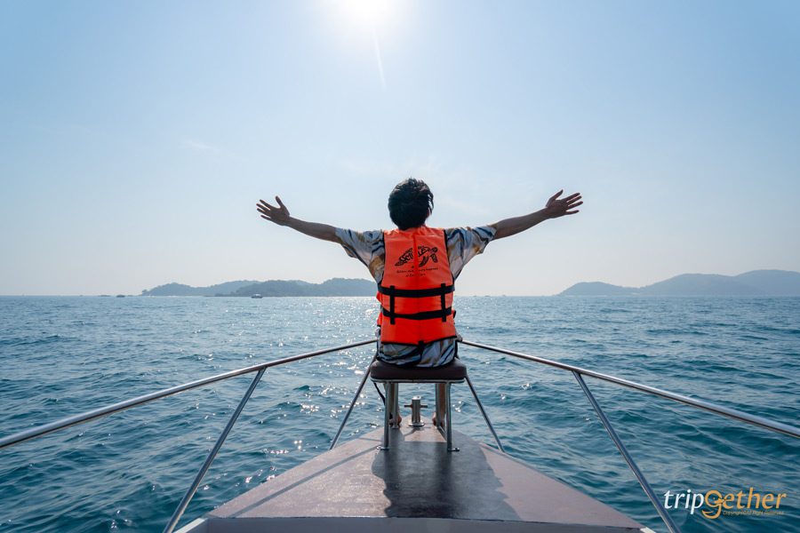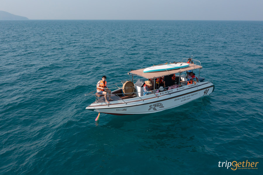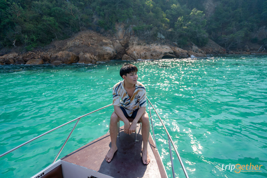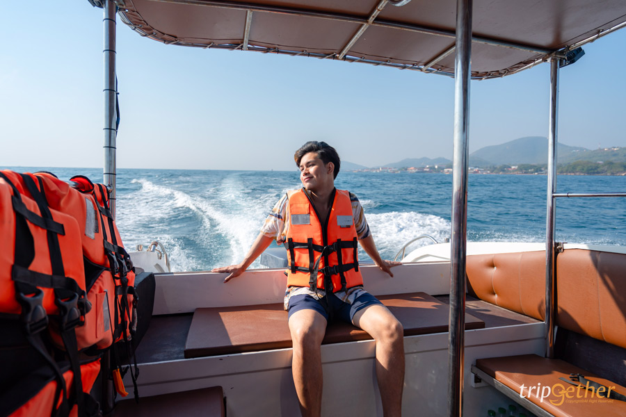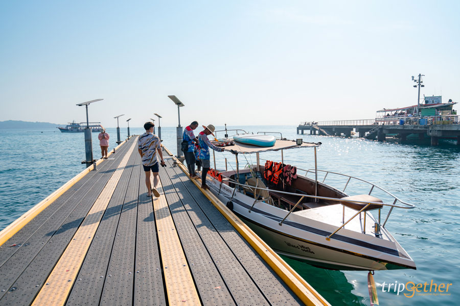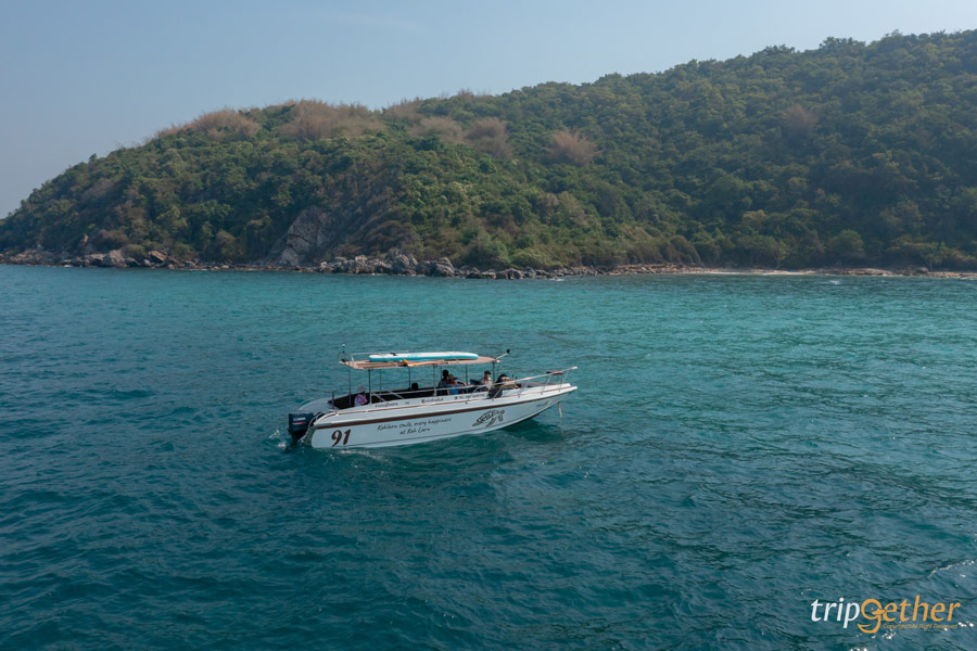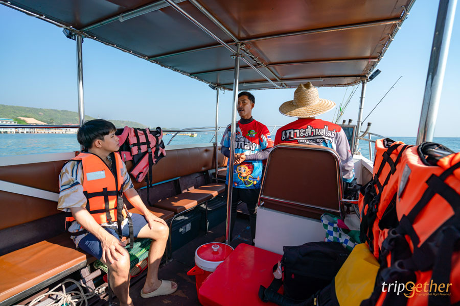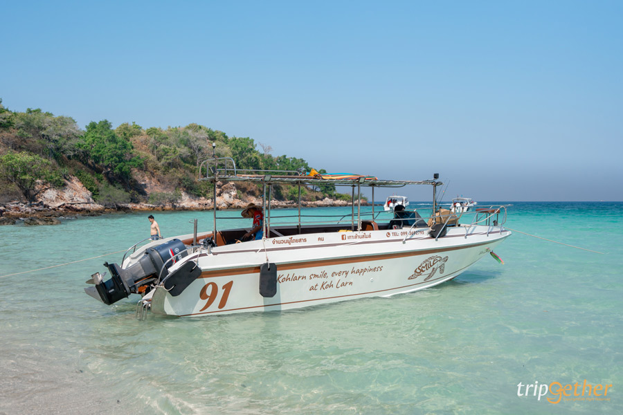 หลังจากติดต่อที่หน้าเคาน์เตอร์แล้ว พนักงานก็จะพาเรามาขึ้นเรือที่ท่าเรือหน้าบ้าน ซึ่งเรือที่ใช้ในทริปเป็นเรือสปีดโบ้ทแบบเช่าเหมาลำ พร้อมด้วยอุปกรณ์อำนวยความสะดวกต่างๆ ทั้งลำโพงให้ฟังเพลงสบายๆ เครื่องดื่ม เสื้อชูชีพ และทีมงานที่ดูแลความปลอดภัย 2 คนตลอดทั้งทริป นอกจากนี้จุดขึ้นเรือสามารถเลือกขึ้นเรือได้ทั้งท่าหน้าบ้านและหาดตาแหวน (ขึ้นอยู่กับช่วงเวลา) พร้อมบริการรับ – ส่งฟรี ไม่ว่าจะพักที่ไหนในเกาะล้าน (รบกวนสอบถามเพิ่มเติมกับทางเกาะล้านสไมล์อีกครั้ง)