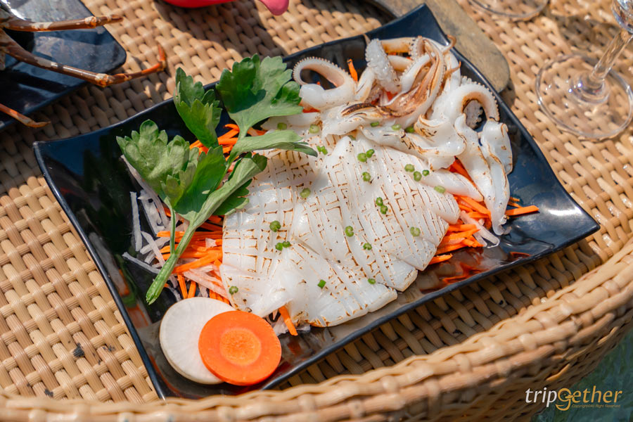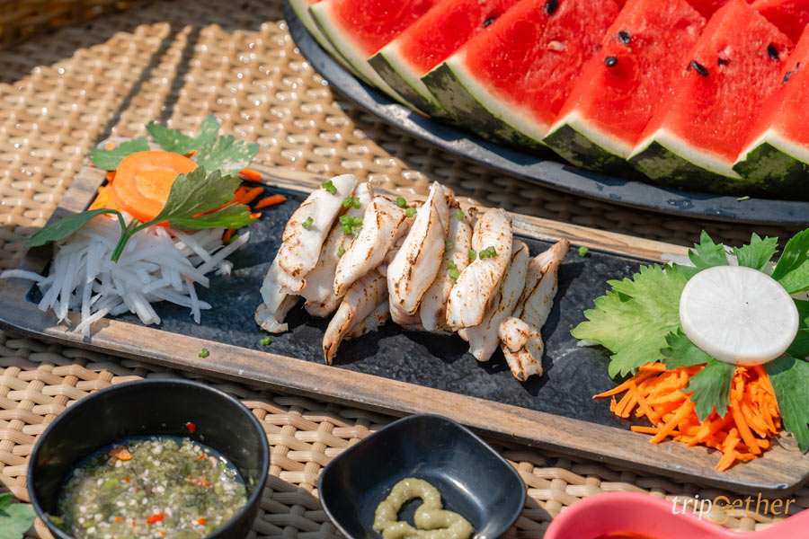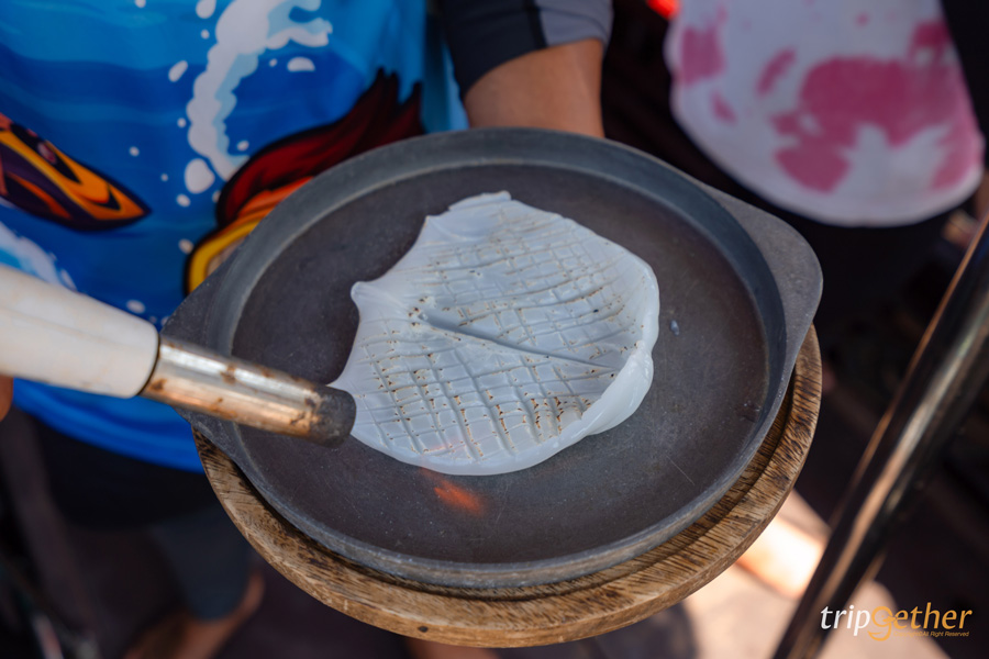 อีกหนึ่งเมนูก็คือหมึกเบิร์นไฟ ที่ใ้ช้หมึกสดๆ น้ำมาแล่ให้เป็นชิ้นพอดีคำ แล้วเบิร์นด้วยไฟบนกระทะร้อน เนื้อหมึกทั้งกรอบ ทั้งหวานอร่อย กินคู่ได้ทั้งกับน้ำจิ้มซีฟู้ดและโชยุ