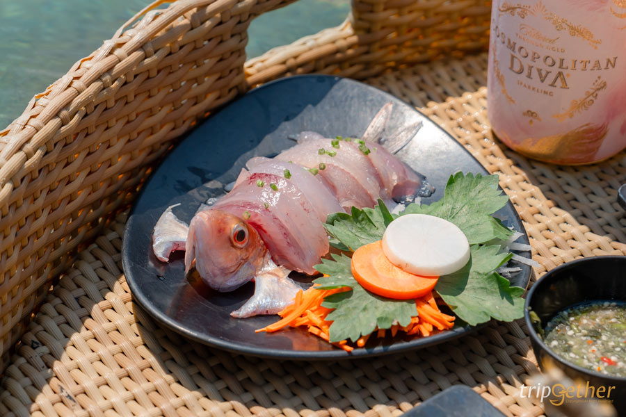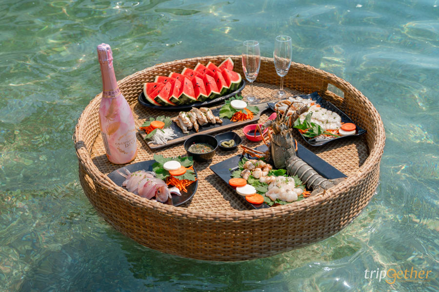 พักผ่อนและถ่ายรูปกันแล้ว ก็ได้เวลาของไฮไลท์อีกหนึ่งอย่างของทริปเกาะสาก Omakase นั่นก็คือ Floating Omakase ถาดอาหารเสิร์ฟบนน้ำ ที่จัดตกแต่งมาอย่างสวยงาม ยิ่งพอได้มาลอยบนน้ำที่ใสเหมือนกระจก บอกเลยว่าถ่ายรูปสวยมากๆ ซึ่งเมนูอาหารที่เสิร์ฟมาเป็นซีฟู้ดแบบสดใหม่และรวมทั้งปลาที่เราตกได้ รวมแล้วมีหลากหลายแบบมากๆ