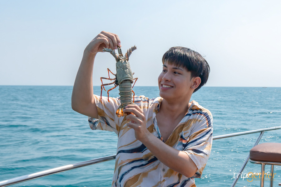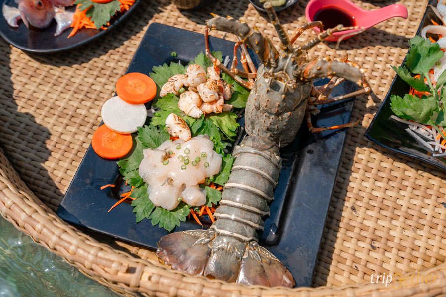 อีกหนึ่งวัตถุดิบที่ทางเกาะล้านสไมล์เตรียมไว้ให้โดยเฉพาะ นั่นก็คือ กุ้งมังกรไซส์ใหญ่แบบสดใหม่ ซึ่งจะแบ่งเนื้อออกเป็น 2 ส่วน เสิร์ฟกันแบบ 2 สไตล์ คือ เสิร์ฟแบบซาชิมิกุ้งมังกร ที่ต้องบอกเลยว่าหวานฉ่ำ สัมผัสนุ่มนวล ไม่คาว และอีกส่วนนำไปเบิร์นให้เนื้อกุ้งรัดตัว ทำให้มีรสสัมผัสที่หวานกรอบ เนื้อเด้ง กินสนุก ยิ่งกินกับน้ำจิ้มซีฟู้ดคือฟินมากๆ