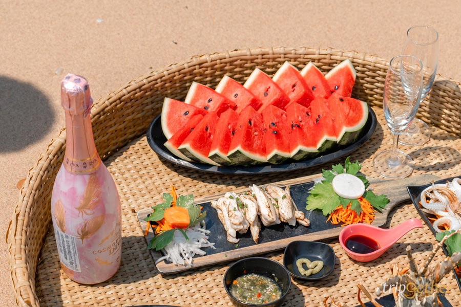 ปิดท้ายด้วยผลไม้เติมความเฟรชให้ร่างกายอย่างแตงโมฉ่ำๆ ชิ้นใหญ่ เนื้อร่วน และเครื่องดื่มเอาใจสายชิลล์อย่าง Sparkling wine ขวดใหญ่ พร้อมแก้วไวน์ให้ริน จิบเบาๆ คู่กับอาหารซีฟู้ดสดๆ บอกเลยว่าได้ฟีลสุดๆ