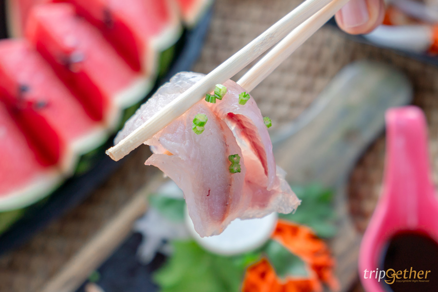 เนื้อปลาอีกส่วนจะเอามาแล่แล้วเบิร์นด้วยไฟให้พอสุก ทำให้เนื้อปลาหอม นุ่ม หวาน และมีรสชาติอร่อยที่แตกต่างออกไปจากซาชิมิ