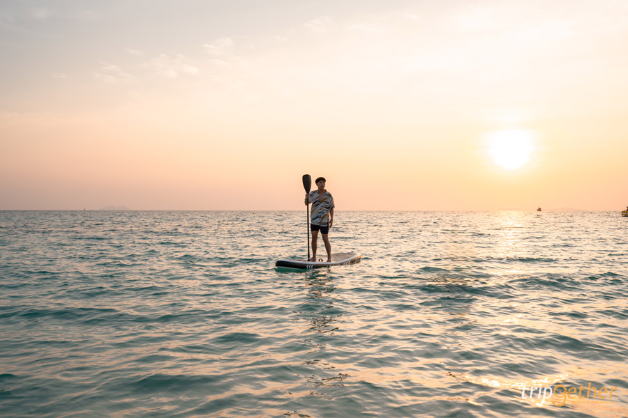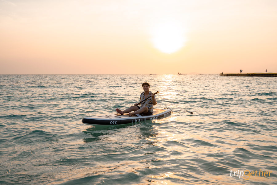 หรือถ้าใครอยากพายเรือก็ยังมีซับบอร์ดให้พายเล่นอีกด้วย จะนั่งพาย หรือยืนโพสเท่ๆ ก็ถ่ายรูปสวยทั้งหมด ยิ่งมีแสงพระอาทิตย์ใกล้จะตกเป็นฉากหลังแบบนี้ยิ่งสวยมากขึ้นไปอีก