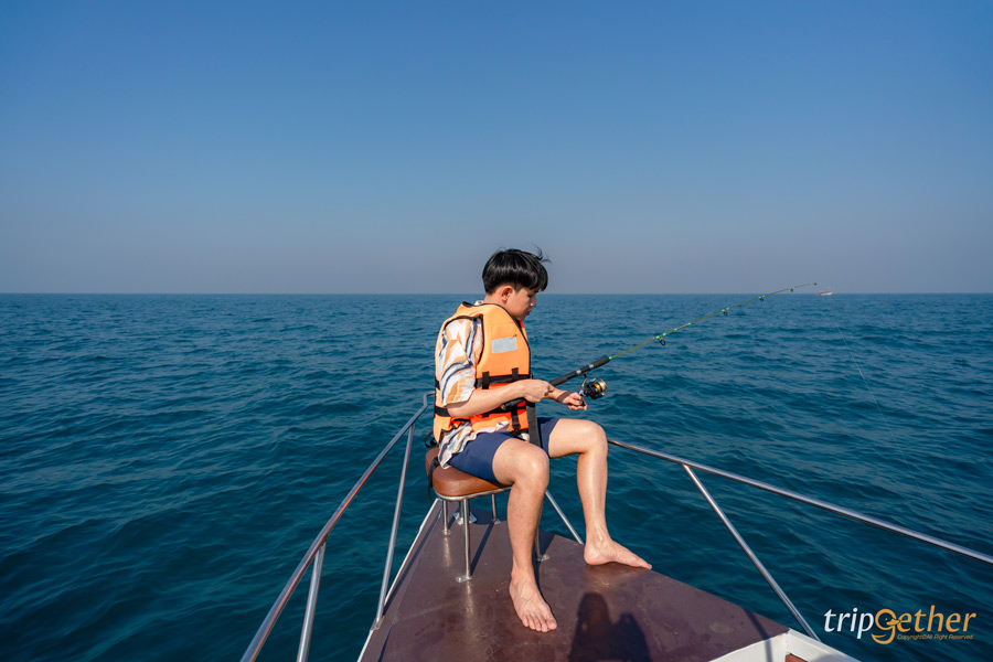 ขับเรือออกมาไกลจากเกาะล้านพอสมควร ทีมงานก็จะจอดเรือและแนะนำวิธีการตกปลาด้วยเบ็ดแบบละเอียด ซึ่งกิจกรรมการตกปลาเป็นไฮไลท์อีกหนึ่งอย่างของทริปนี้ เพราะปลาที่เราตกได้ก็คือวัตถุดิบที่จะใช้เป็นเมนูซาชิมิในทริป บอกเลยว่าลุ้นและตื่นเต้นมากๆ ว่าจะตกปลาได้มากน้อยแค่ไหน และได้ปลาอะไรบ้าง (แต่ไม่ต้องห่วง ว่าจะได้ปลาน้อย เพราะทีมงานที่มากับเราก็จะช่วยตกด้วยอีกแรง)