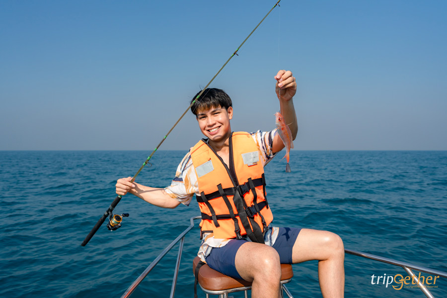 นั่งหย่อนเบ็ดได้ไม่นาน ก็มีปลามากินเหยื่อ ซึ่งสำหรับใครที่กังวลว่าจะตกไม่ได้ หายห่วงได้เลย เพราะอย่างเราที่ไม่ค่อยมีประสบการณ์และความชำนาญก็ตกได้เยอะมากๆ ซึ่งส่วนใหญ่ปลาที่ตกได้จะเป็นปลาทรายแดงที่มีเนื้อขาว หวาน และไขมันน้อย เหมาะกับการเอามาทำซาชิมิสุดๆ และระหว่างการตกปลาทีมงานจะเปลี่ยนจุดตกไปเรื่อยๆ ตามกระแสน้ำและแหล่งที่มีปลาชุม