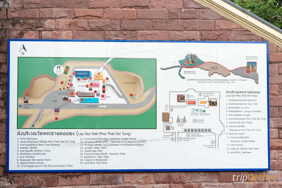 จากวัดพระธาตุดอยตุง (วัดน้อย) อยู่ห่างจากพระธาตุดอยตุงประมาณ 1 กิโลเมตร และเส้นทางค่อนข้างชัน จุดแรกที่มาถึงจะบริเวณทางขึ้นพระธาตุดอยตุง ตรงนี้จะมีลานจอดรถจุดแรก สามารถจอดรถที่บริเวณนี้แล้วเดินเท้าขึ้นบันไดไปจุดบนสุดของพระธาตุดอยตุงได้ หรือถ้าใครเดินไม่ไหวก็สามารถขับรถขึ้นไปด้านบนได้เลย **แต่ถนนชันมาก รถอีโค่คาร์อาจขึ้นยากหน่อย ตรงนี้จึงมีมอเตอร์ไซค์ชาวบ้านรับจ้างพาขึ้นไป