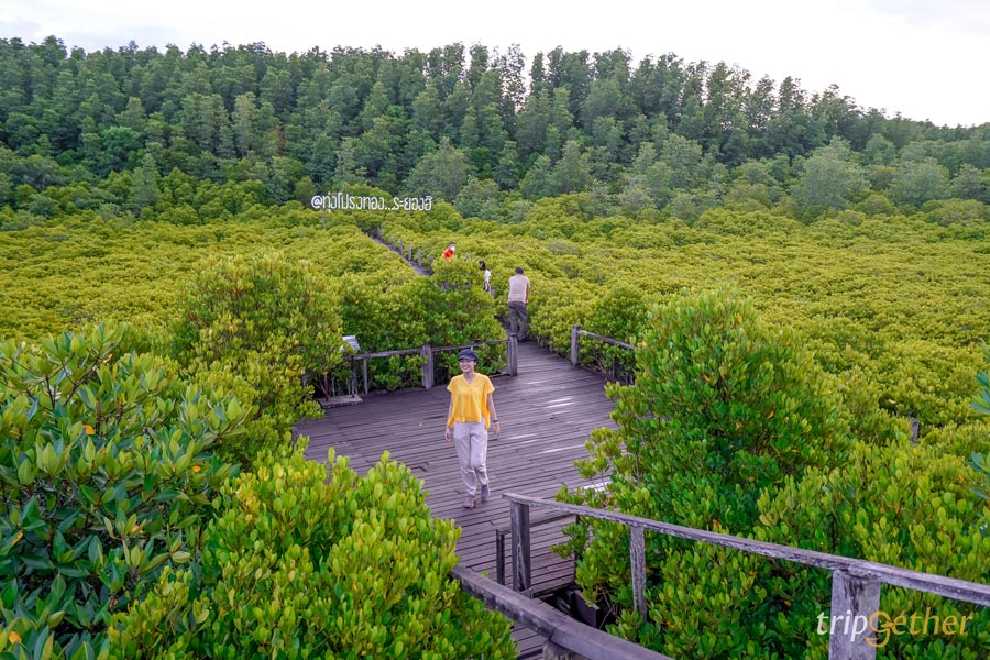 เดินมาไม่นานก็เดินมาถึงจุดหนึ่ง ที่ต้องร้อง ว้าวววววววววว!!! เพราะสิ่งที่เห็นอยู่ข้างหน้าคือวิวของทุ่งโปรงทองแบบ 360 องศา ซึ่งถือว่าเป็นไฮไลท์ของที่นี่ ต้องบอกก่อนเลยว่ามันอเมซิ่งมาก หากใครที่เคยคิดว่าป่าชายเลย แดดร้อนๆ ไม่น่าเที่ยว อยากให้ลองคิดใหม่เพราะที่นี่สวยและอุดมสมบูรณ์มากๆ แสงแดดที่ส่องลงมากระทบสีเขียวอ่อนของต้นโปรงทำให้มองเห็นเป็นสีทองอยู่ด้านหน้าและล้อมรอบตัวเรา เห็นแล้วหายเหนื่อยจนลืมอากาศร้อนๆ ไปเลย บรรยากาศของธรรมชาติมันฟินอย่างนี้นี่เอง