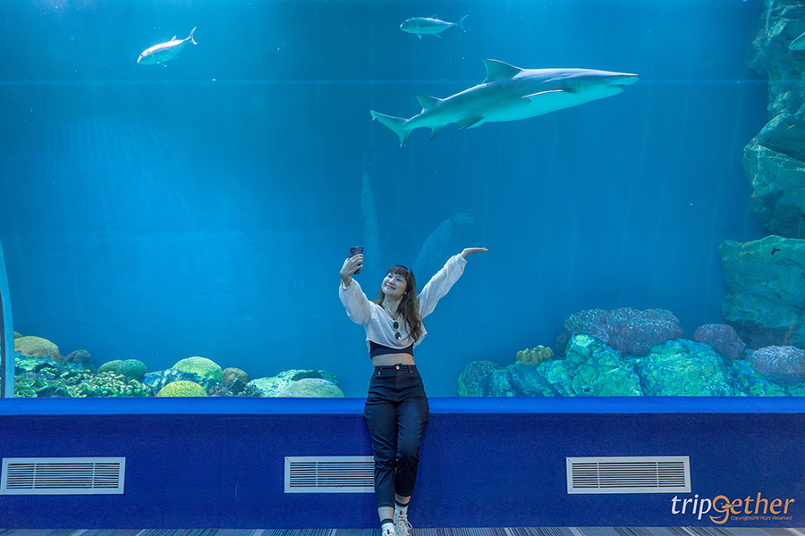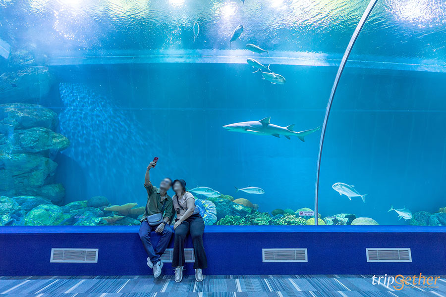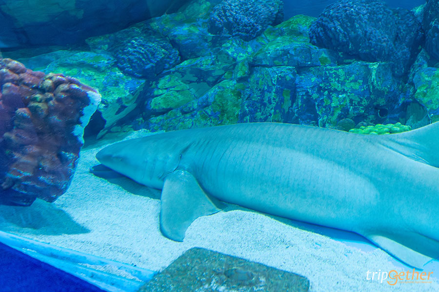 หลังจากเราเดินดูปลาตัวน้อยๆ ไปแล้วก็มาถึงอีกจุดเช็คอิน อุโมงค์ปลาฉลามที่กว้างสุดในเอเชีย มาที่นี่จะได้เจอกับตู้ฉลามขนาดใหญ่ พร้อมกับตื่นตากับฉลามมากถึง 4 สายพันธุ์ ไม่ว่าจะเป็นฉลามพยาบาล ฉลามเสือดาว ฉลามเสือทราย ฉลามเลมอน และด้วยความที่เป็นตู้ใหญ่ทำให้เราสามารถดูฉลามได้แบบใกล้ชิด เอาจริงๆ ถ้าไม่ได้มาพิพิธภัณฑ์สัตวน้ำก็คงไม่ได้เจอฉลามตัวเป็นๆ แบบนี้