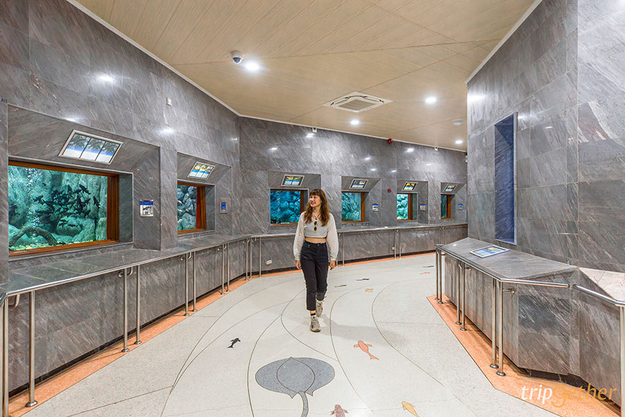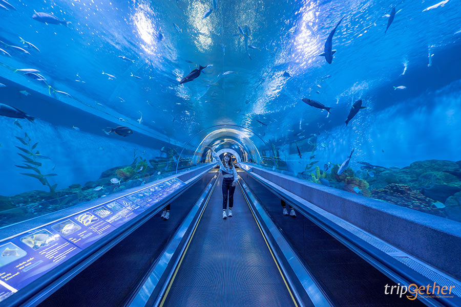 เมื่อลงมาจากบันไดเลื่อนจะเจอกับอุโมงค์ปลาที่ยาวกว่า 75 เมตร ตรงนี้มีปลาทะเลหลายชนิด พากันว่ายไปมาอย่างอิสระ รวมถึงมีปะการังสีสันสนใจ เรียกได้ว่าตลอดทางเดินมีแต่ส่ิงที่น่าสนใจ ต้องแวะถ่ายรูปตลอดทาง