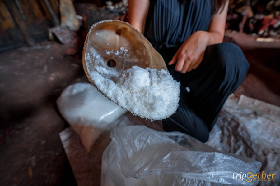 มีเกลือถุงเล็กๆ แบ่งขายให้กับนักท่องเที่ยวด้วยนะ สามารถนำมาขัดผิวและทำอาหารได้อย่างปลอดภัย