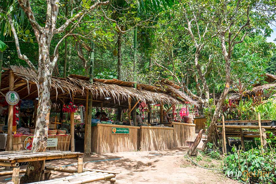 สำหรับใครที่ซื้ออาหารมาแล้วอยากนั่งกินในตลาด ทางตลาดก็เตรียมโซนนั่งกินริมน้ำตก บรรยากาศก็ดีมากๆ แม้ว่าจะมาช่วงเที่ยงๆ อากาศก็ไม่ได้ร้อนมากเพราะมีต้นไม้สูงใหญ่คอยให้ร่มเงา บวกกับมีน้ำตกอยู่ข้างๆ ทำให้ได้ลมเย็นๆ จากสายน้ำพัดเข้ามาบริเวณที่นั่งตลอด ดื่มด่ำกับธรรมชาติเพลินๆ กินอาหารไปพลางฟังเสียงน้ำตกไปพลาง บอกเลยคือฟินมาก