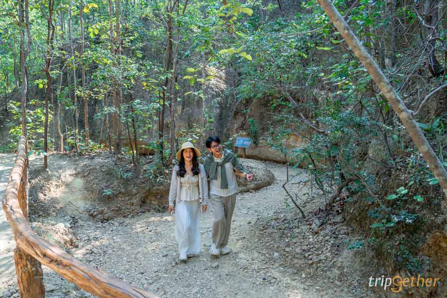 แกรนด์แคนยอนเมืองไทยแห่งนี้ ตั้งอยู่ในเขตอุทยานแม่วาง ห่างจากตัวเมืองเชียงใหม่โดยขับรถประมาณ 1 ชั่วโมง เปิดให้เข้าชมทุกวัน ตั้งแต่เวลา 08.30-16.30 น. ค่าเข้าเข้าชม 20 บาท และค่าที่จอดรถ 30 บาท เราแนะนำเพื่อนๆ ที่ไม่อยากเดินไกลมากให้จอดรถที่ลานจอดรถที่ 3 โดยภายในอุทยานมีเส้นทางศึกษาธรรมชาติระยะทางประมาณ 500 เมตร ไม่ไกลจากที่จอดรถ เดินชิลล์ๆ มีป้ายแนะนำอธิบายให้ความรู้ตลอดทาง และจุดเช็คอินที่แรก เป็นระเบียงกว้างมองเห็นวิวภูมิประเทศของอำเภอดอยหล่อ ภาพยอดต้นไม้น้อยใหญ่สลับกันไปมา สวยงามมาก