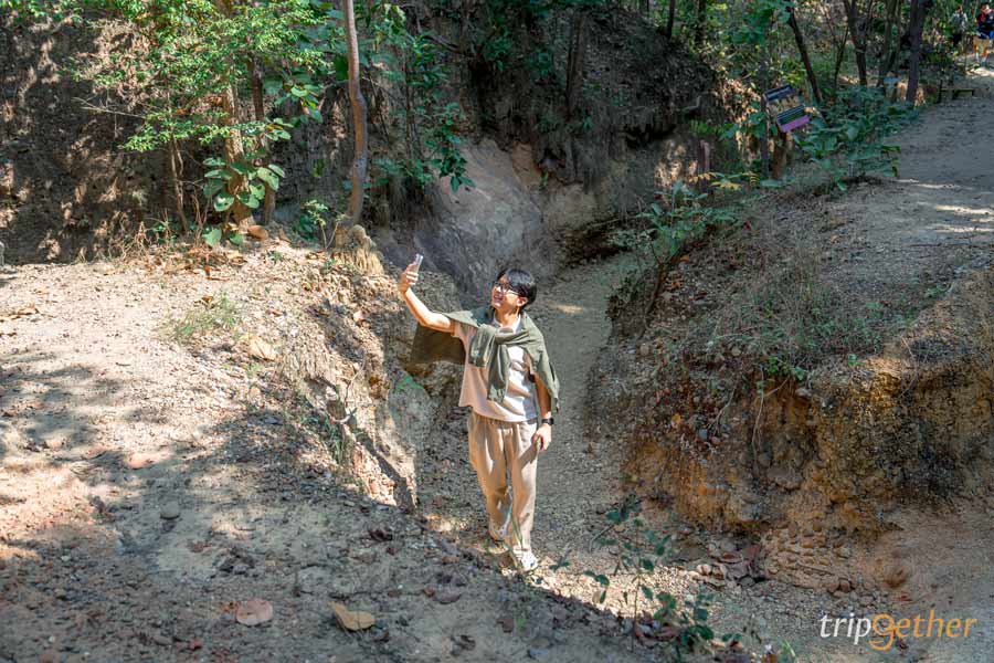 ระหว่างทางมีป้ายอธิบายปรากฏการณ์อย่างละเอียด โดยมีทั้งสิ้น 11 จุด แต่ละจุดจะมีความแตกต่างกันออกไปจากสภาพของพื้นที่ มีทางเดินแบ่งออกเป็น 2 ฝั่ง คือฝั่งที่ทางอุทยานได้สร้างขึ้นเพื่อให้เดินได้สะดวก กับทางร่องน้ำธรรมชาติ ซึ่งเราเลือกเดินด้านล่าง เพื่อจะได้สัมผัสกับประติมากรรมนี้อย่างใกล้ชิด นอกจากหินกรวดมนที่เป็นทางสายน้ำเก่าแล้ว ยังมีรากต้นไม้ที่ชอนไชตามหน้าดิน มองเห็นเป็นชั้นๆ มองแล้วแปลกตาดีครับ