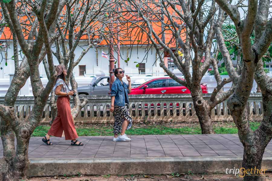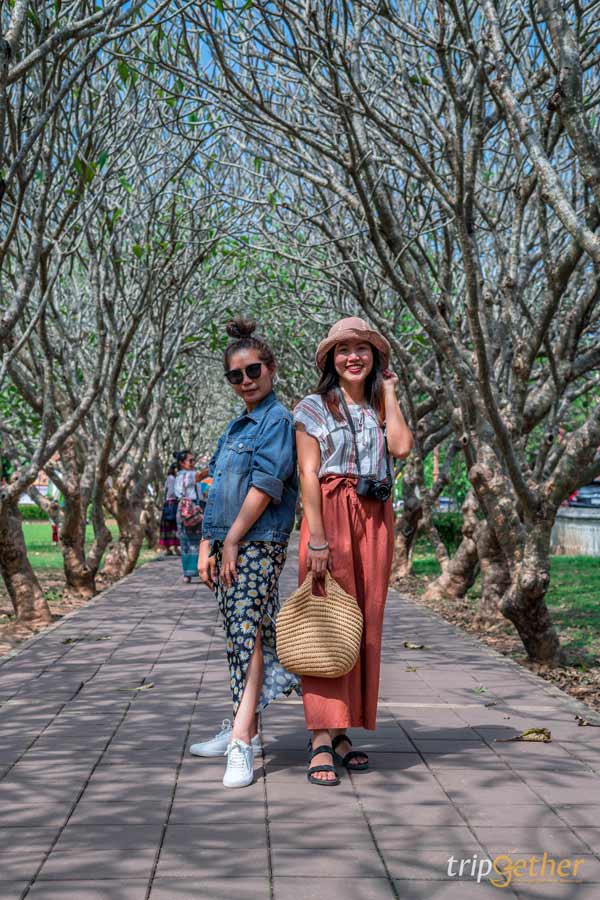 โดยต้นลีลาวดีนั้นจะขึ้นเป็นแถวเรียงราย 2 ข้างทางเดิน และแผ่ขยายกิ่งก้านโค้งเอียงเข้าหากัน เป็นอุโมงค์ต้นไม้ที่สวยงดงามมากๆ แม้ว่าช่วงที่เดินทางไปนั้น ซุ้มลีลาวดี จะไม่ได้มีดอกไม้บานสะพรั่งให้เชยชม แต่ก็ยังโดดเด่นสวยงาม ได้ภาพสวยๆ กลับมาเพียบเลยล่ะ