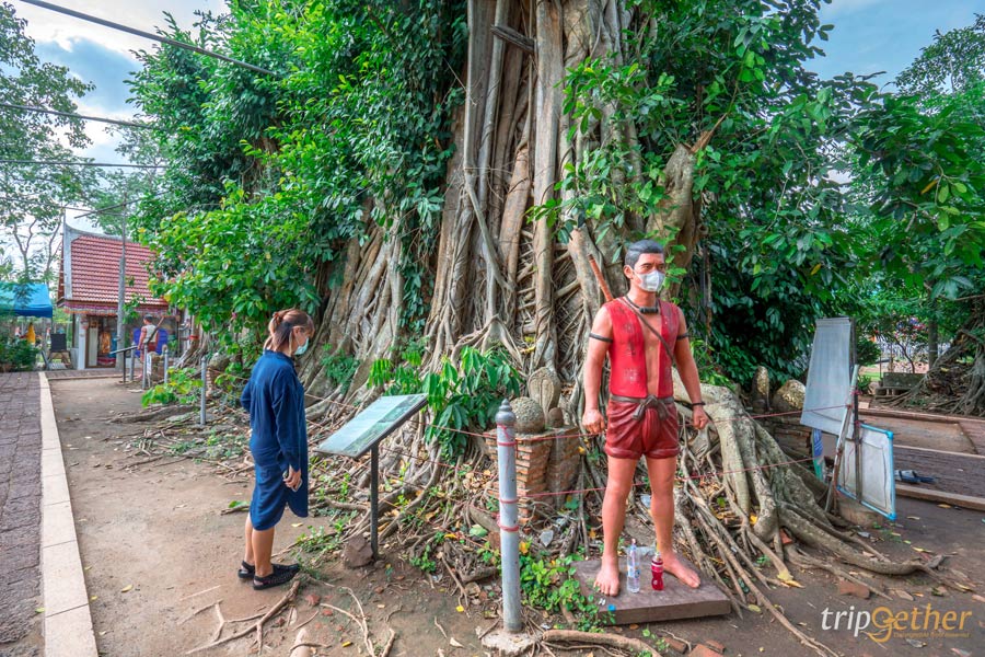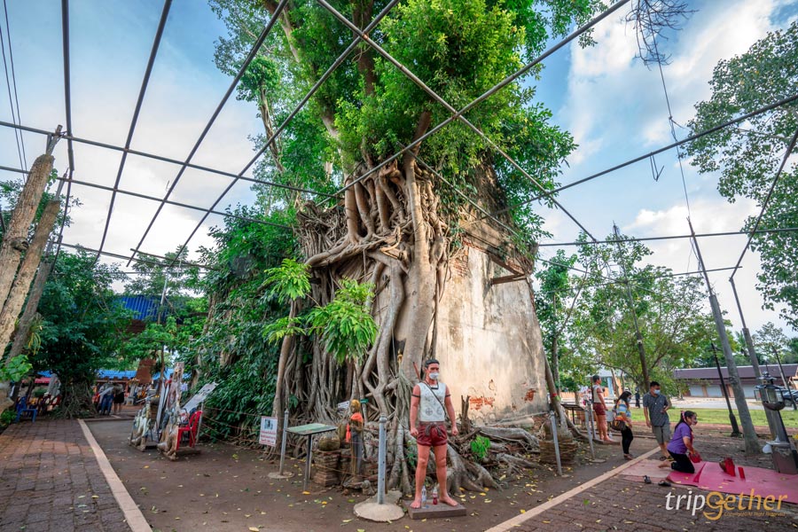 โบสถ์ของวัดถูกต้นไม้ใหญ่ 4 ชนิดปกคลุมอยู่ ได้แก่ ต้นโพธิ์ ต้นไทร ต้นไกร และต้นกร่าง