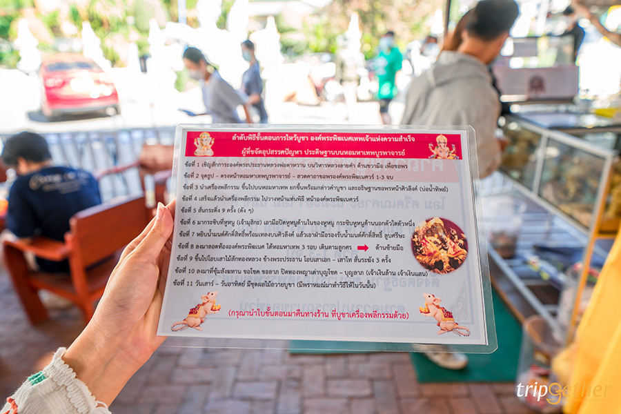 จากนั้นขั้นตอนก็จะเหมือนกับคนที่ไหว้ชุดผลไม้มงคลเลยคือ กระซิบที่หูหนู เอามือปิดหูด้านในแล้วกระซิบที่หูด้านนอก สรงน้ำศิวลึงค์และเอามือรองรับน้ำมนต์แล้วลูบศีรษะ ลอดท้ององค์พระพิฆเนศวร ใต้หอมหาเทพบูรพาจารย์ตามลูกศร 3 รอบ โอบเสาไม้สักทองหลวง เสาเอก เสาโท ข้างพระประธาน สั่นระฆัง 3 ครั้ง และปิดทองขอโชคขอลาภที่พญาเต่าบุญโชค – บุญลาภ