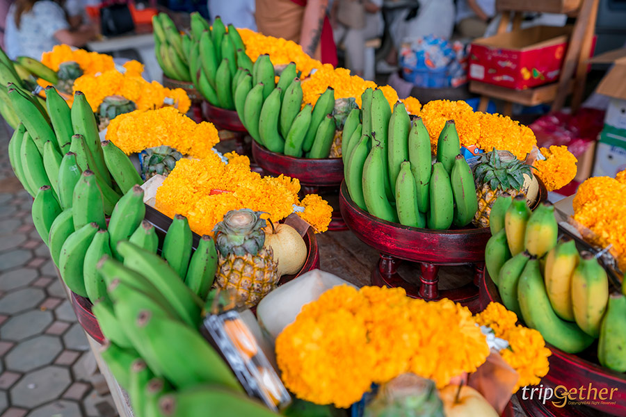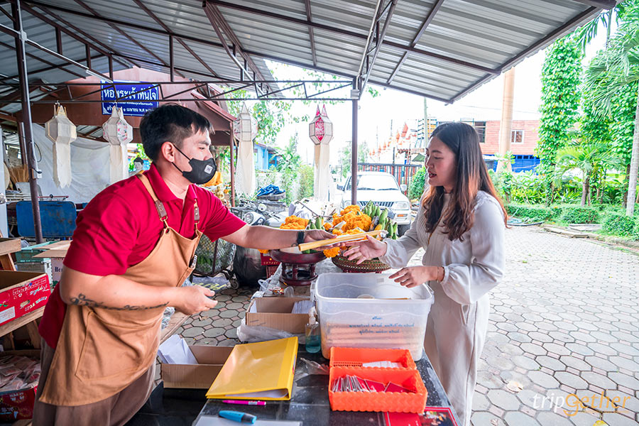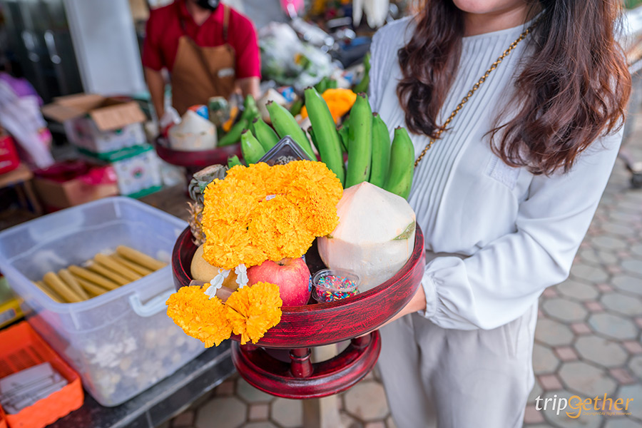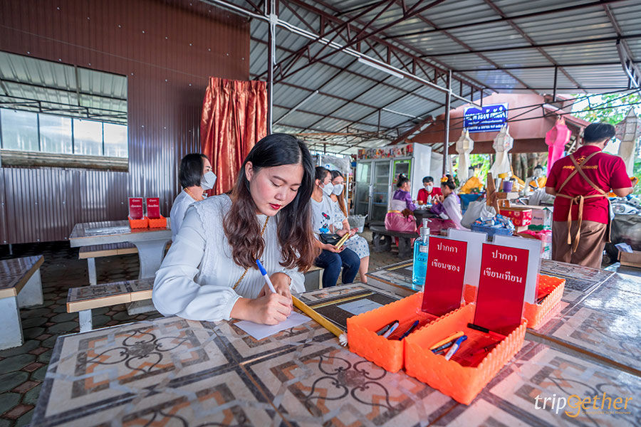 คนที่จองคิวมาจะต้องมารับซองจดหมายและเทียน เขียนชื่อ นามสกุล ยื่นรับคิว และรอเรียกรับชุดผลไม้มงคล ซึ่งชุดผลไม้มงคลเราจะจ่ายเงินตอนจองคิวเลย ราคา 599 บาท มาถึงก็มารับคิวได้เลย