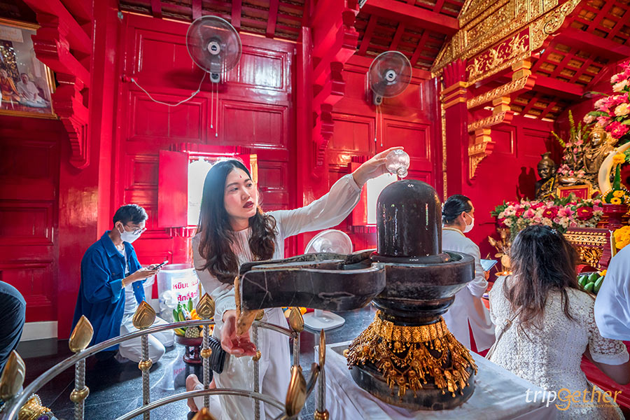 ต่อมาก็เป็นขั้นตอนสรงน้ำศิวลึงค์และเอามือรองรับน้ำมนต์แล้วลูบศีรษะ