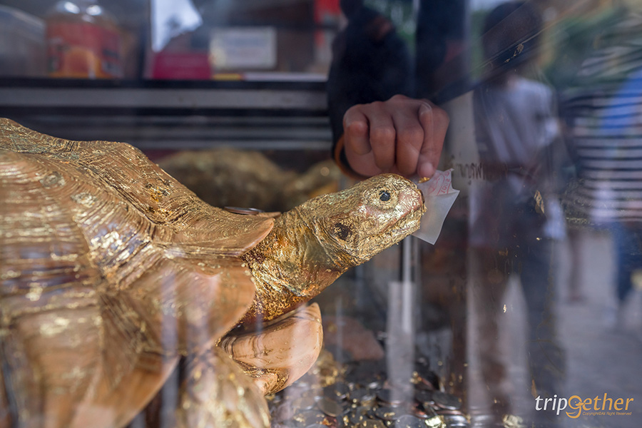 จากนั้นก็มากันที่ขั้นตอนสุดท้ายคือการปิดทองพญาเต่า ขอโชค ขอลาภ กับเจ้าเงินล้านและเจ้าเงินแสนที่อยู่บริเวณซุ้มสังฆทานเป็นอันเสร็จพิธี