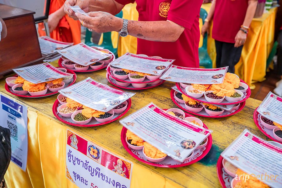 นอกจากชุดผลไม้มงคลแล้วทางวัดก็มีชุดธัญพืชมงคลสำหรับคนที่ไม่ได้จองคิวมาหรือไม่ได้ต้องการเข้าพิธีอารตีไฟและเจิมหน้าผากกับพราหมณ์ก็สามารถบูชาชุดธัญพืชมงคลขอพรพระพิฆเนศได้เลยโดยขั้นตอนจะต่างจากชุดผลไม้มงคลคือเราสามารถทำได้ด้วยตัวเองไม่ต้องให้พราหมณ์ทำพิธีให้ คือไหว้ขอพรหลวงพ่อตาหวานองค์พระประธานบนวิหารหลวงลายคำ จากนั้นจุดรูปที่ตะเกียงหน้าหอมหาเทพบูรพาจารย์ และสวดคาถาขอพรองค์พระพิฆเนศ 1 – 3 จบ นำชุดขอพรวางบนแท่นพิธีหน้าหอมหาเทพบูรพาจารย์ และสั่นกระดิ่งดังๆ 9 ครั้ง