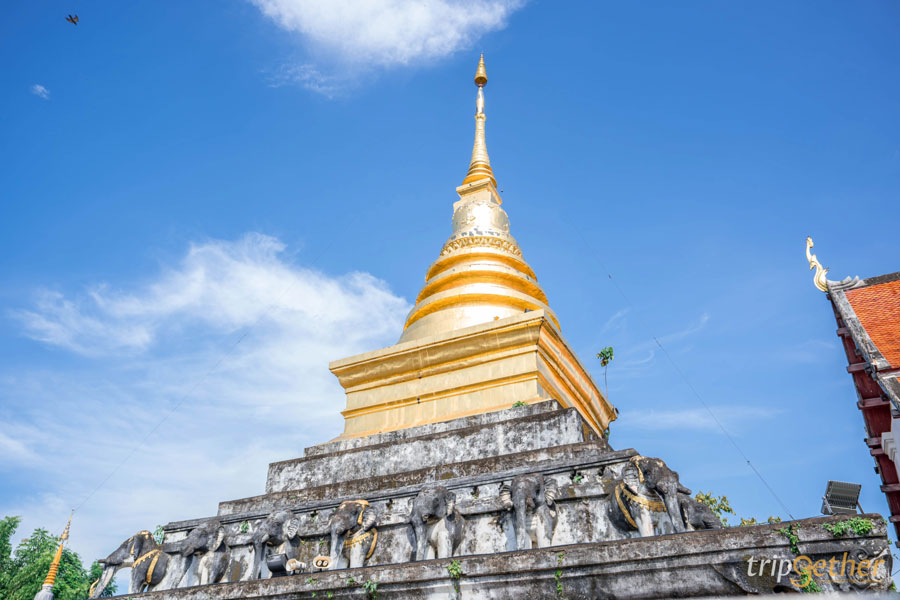 สำหรับจุดไฮไลท์ภายในวัดที่ไม่ควรพลาด จุดแรก คือ เจดีย์ช้างค้ำ เจดีย์ทรงลังกาแบบศิลปะล้านนาสีทองอร่าม โดดเด่นกลางลานวัด สวยงามทั้งกลางวันและตอนเย็นเลยล่ะ เอกลักษณ์คือฐานประดับด้วยช้างปูนปั้นครึ่งตัว 24 เชือก ที่ดูเหมือน ค้ำ เจดีย์ไว้ บอกเลยว่าเป็นจุดถ่ายรูปยอดฮิต!