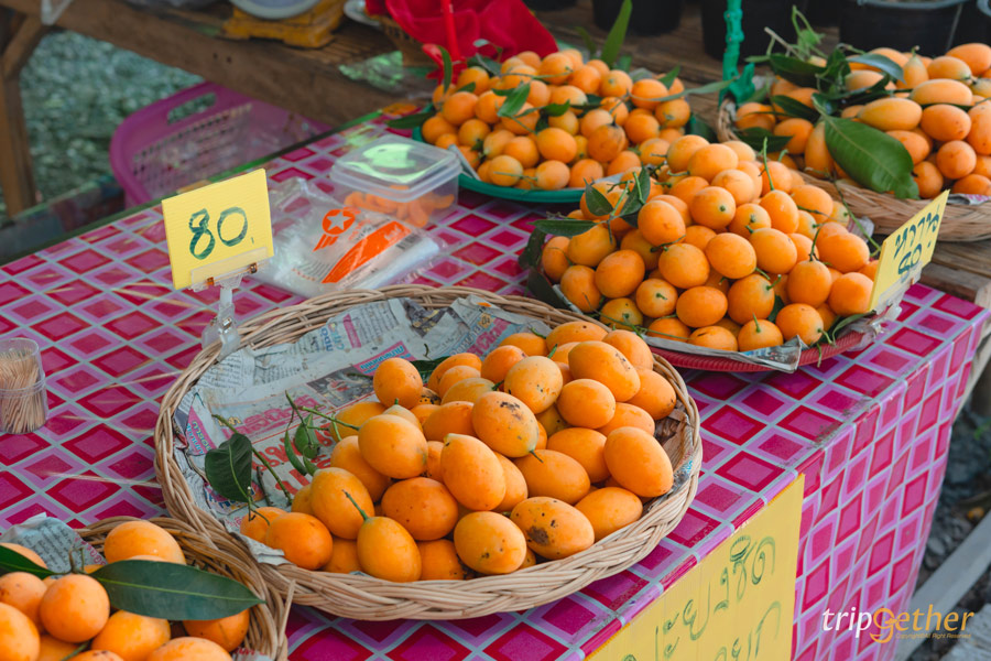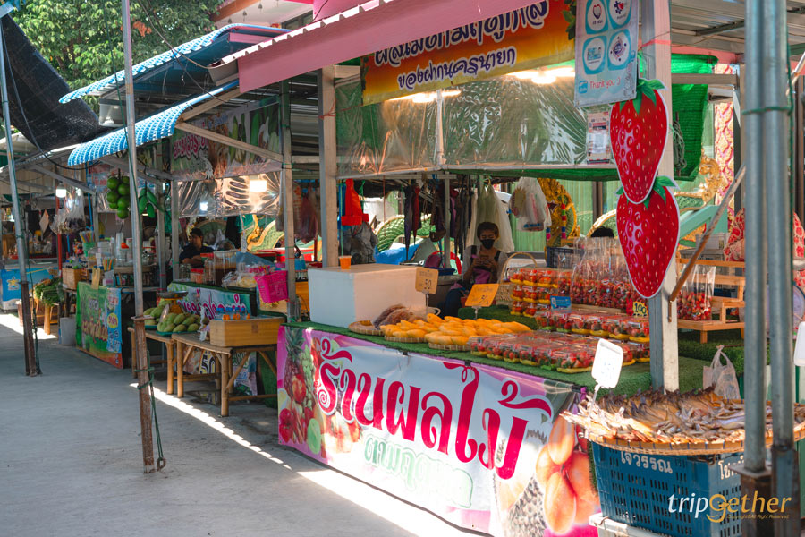 ไหว้พระ ขอพร และชมความงามกันจนอิ่มบุญ อิ่มใจกันแล้ว มาหาอะไรเติมใส่ท้องกันต่อกับตลาดนัดชุมชนเล็กๆ ในพื้นที่ของวัด มีคุณลุง คุณป้านำของขึ้นชื่อของเมืองนครนายกมาขายด้วย นั่นก็คือมะยงชิด แถมยังมีของกิน ขนม น้ำหวานอีกเพียบ สามารถฝากท้องไว้กับที่นี่ได้เลย