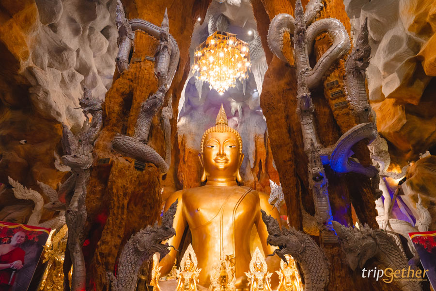 เมื่อเดินเข้าสู่ภายในวังเราก็จะพบกับพระรัตนมณีมหาบาดาล พระพุทธรูปองค์ใหญ่สีทองอร่ามเด่นตระหง่านประดิษฐานอยู่ท่ามกลางเหล่าพญานาค ถือเป็นภาพที่สวยงามอย่างมาก รวมทั้งประติมากรรมปูนปั้นต่างก็ละเอียดเป็นที่สุด กราบสักการะแล้วถ่ายรูปสักหน่อย ก่อนเดินชมความงดงามกันต่อ