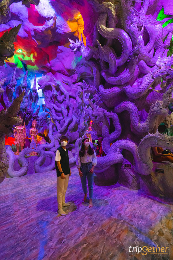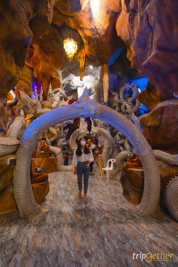 ไปชมความงามของวังพญานาคกัน โดยด้านหน้าทางเข้าอาคารที่เป็นที่ตั้งของถ้ำจะพบกับสะพานที่เป็นประติมากรรมปูนปั้นที่จำลองการข้ามห้วงนรก ตัวสะพานจะเป็นพญานาคห้าเศียรพร้อมองค์พญานาคจำแลงที่อยู่ในสระบัว ซึ่งด้านข้างถัดจากสระบัวจะเป็นห้วงนรกที่มีมือจำนวนมากชูขึ้นมา ถือว่าเป็นงานศิลป์ชั้นยอดที่ประณีตสุดๆ และแฝงคติธรรมข้อคิดได้เป็นอย่างดี