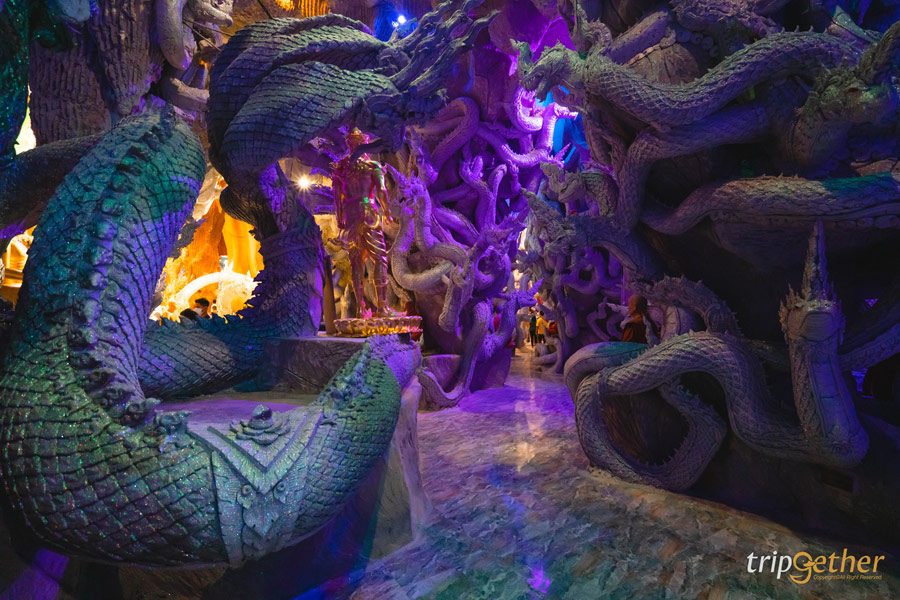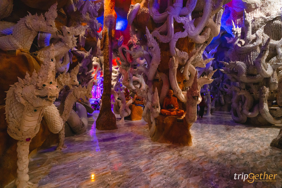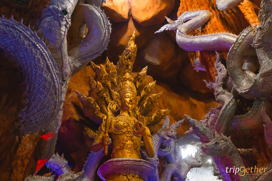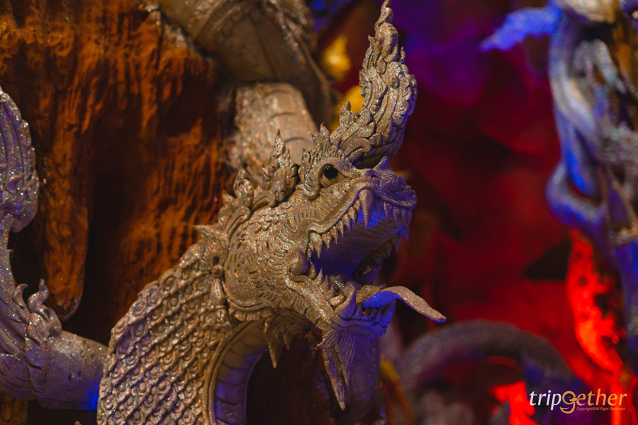 ไม่ว่าจะมองไปมุมไหนเราก็จะเห็นประติมากรรมปูนปั้นพญานาคสวยๆ ไปหมด และเมื่อเวลาที่แสงไฟสีต่างๆ ส่องมากระทบกับพญานาคก็จะเห็นเป็นประกายเพชรระยิบระยับอีกด้วย