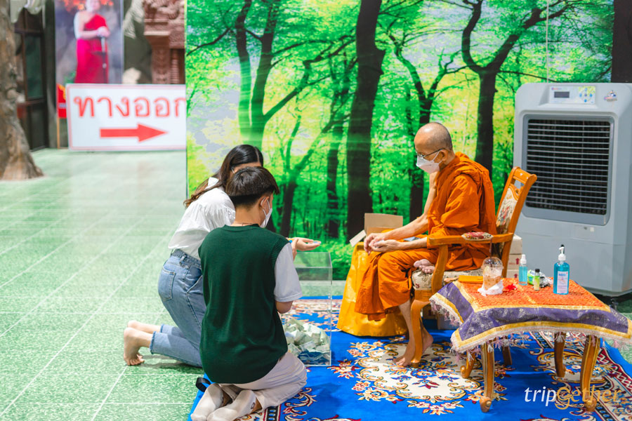 ก่อนออกจากตัวอาคารก็จะมีหลวงพ่อท่านนั่งอยู่ เราสามารถเข้าไปกราบและถวายปัจจัยเพื่อทำนุบำรังวัดกับท่านได้ และแอบกระซิบว่าหลวงพ่อท่านมีเหรียญพญานาคของทางวัดให้เราเก็บกับมาบูชาด้วยกันนะ