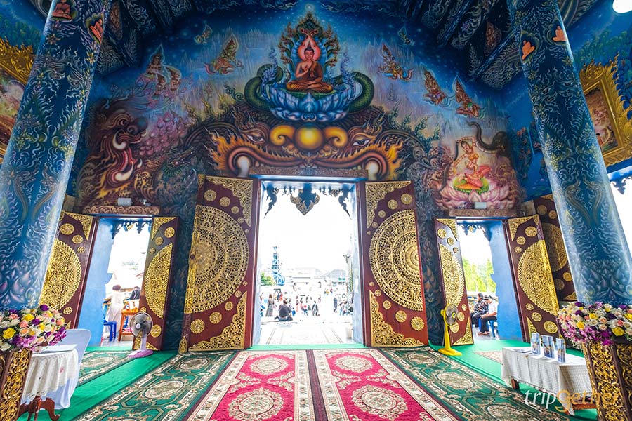 ภายในวิหารยังเป็นที่ประดิษฐานพระพุทธรัชมงคลบดีตรีโลกนาถ สีขาวมุกขนาดหน้าตักกว้าง 5 เมตร สูง 6.5 เมตร โดยมีพระรอดลำพูน จำนวน 88,000 องค์ แถมยังมีจิตรกรรมฝาผนังที่บอกเล่าเรื่องราวของพระพุทธเจ้า อันวิจิตรงดงามให้ได้ชมกัน