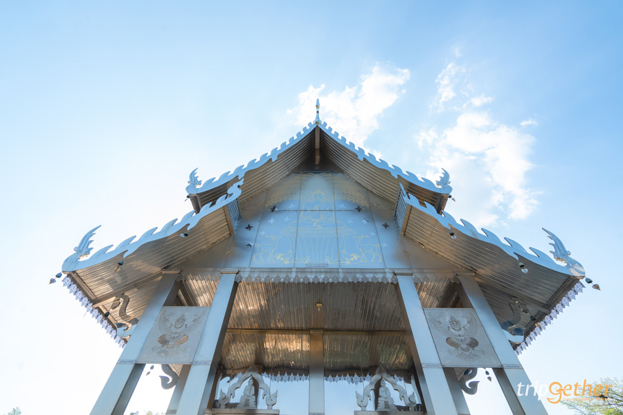 บริเวณหน้าบันของโบสถ์มีภาพของพระพุทธเจ้าประทับ ณ โพธิบัลลังก์อยู่ รวมทั้งช่องเสาทางซ้ายและขวายังมีภาพของพญาครุฑอยู่อีกด้วย สวยงามสุดๆ เหมือนกับวิหารแก้วมากๆ